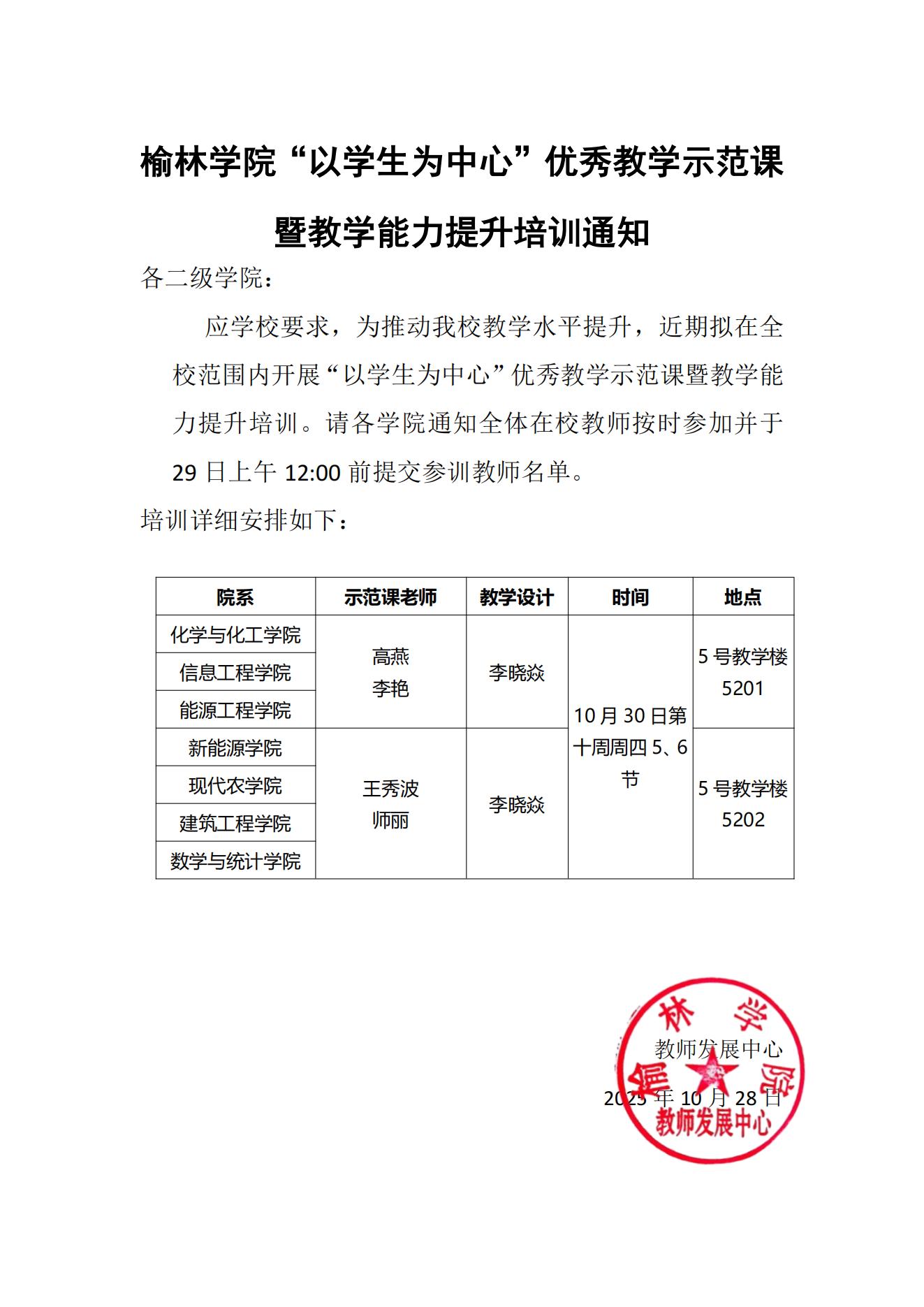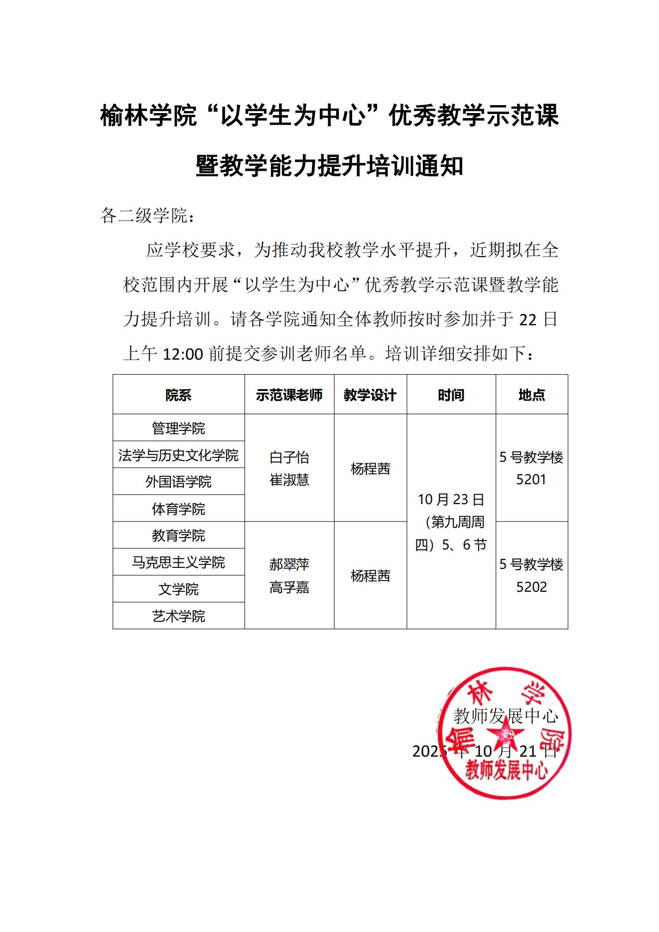 榆林学院“以学生为中心”优秀教学示范课 暨教学能力提升培训通知